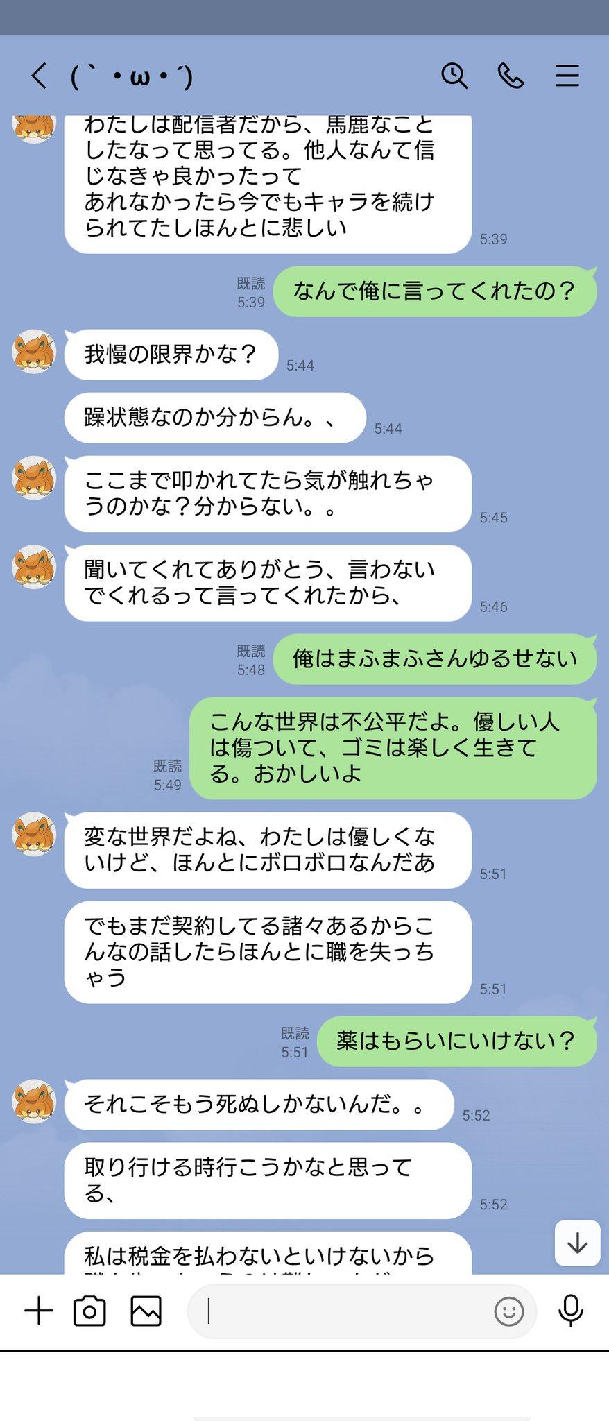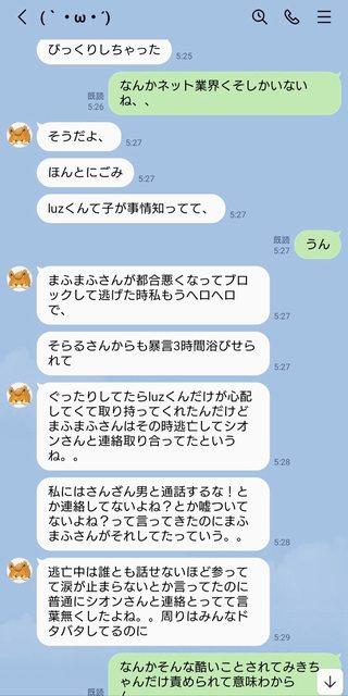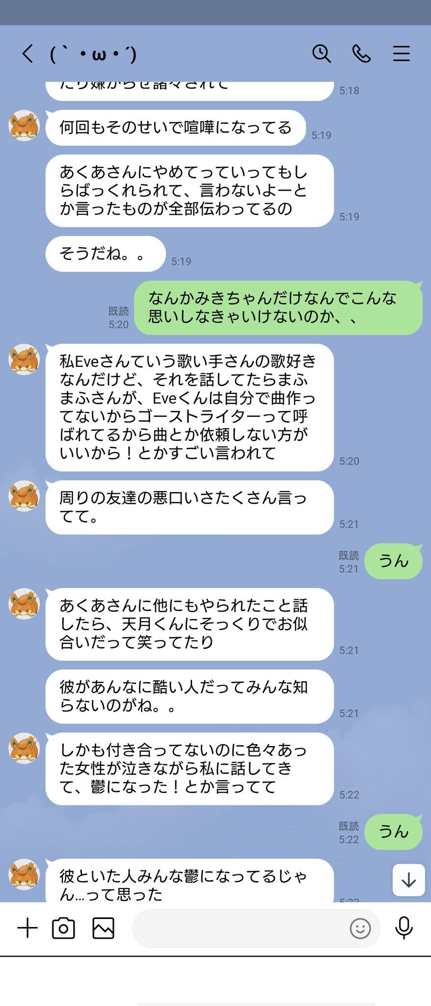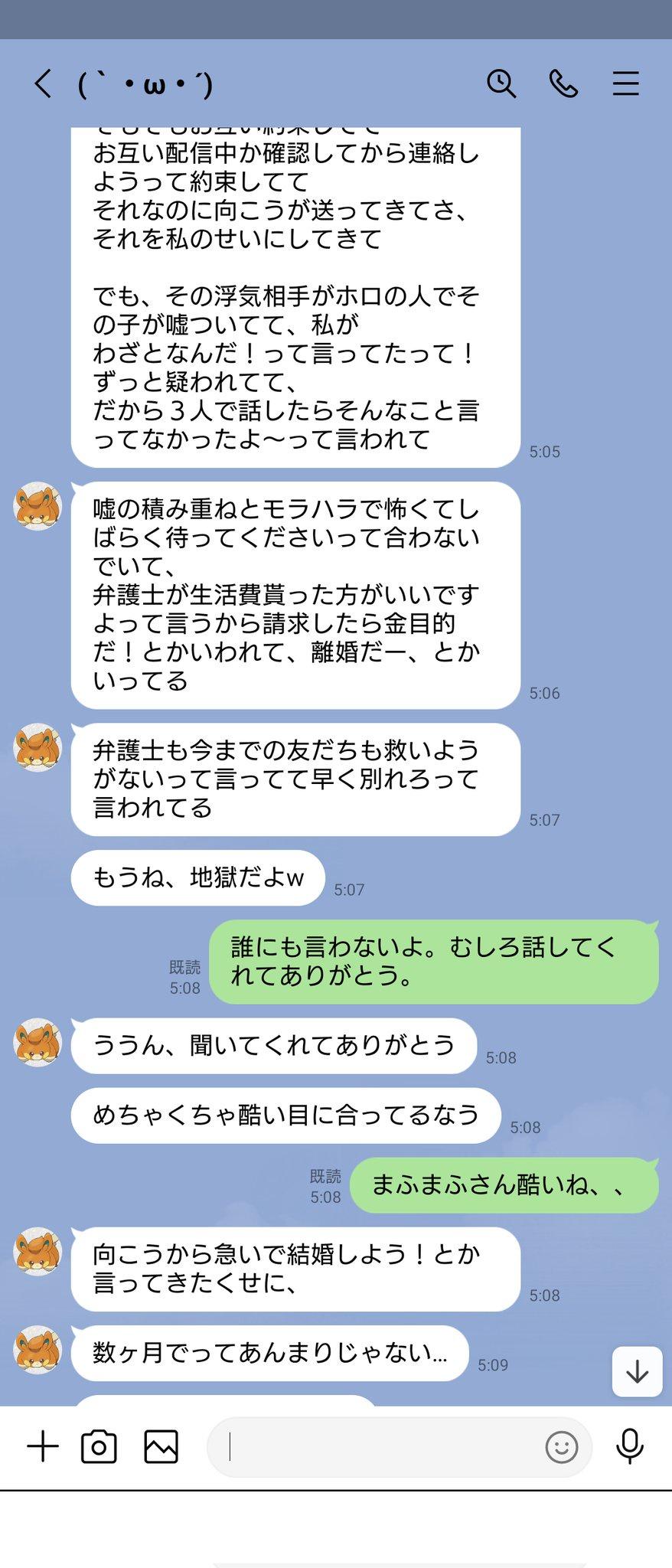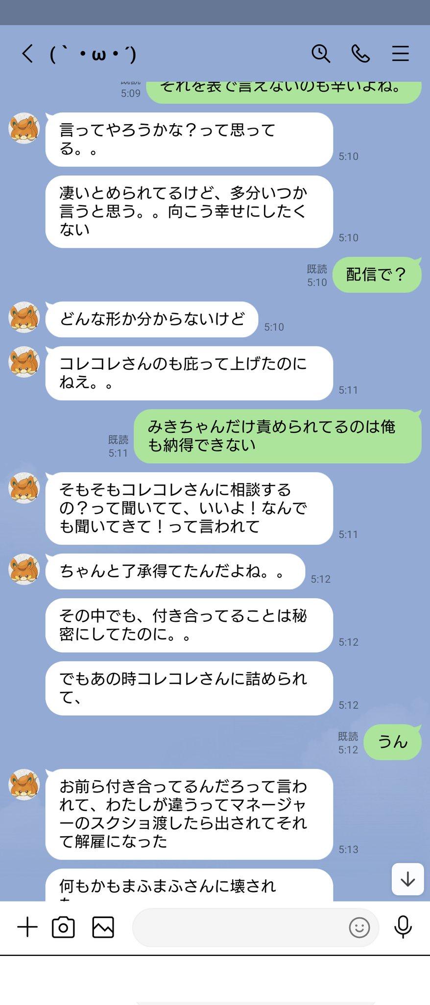 本来计划从今年3月开始同居,那时候打算告诉大家的,但2月份发生了炎上事件。在那次炎上期间,Mafumafu过去有过身体关系的人联系了我,于是我们(mafumafu与我)吵架了,然后我被拉黑。